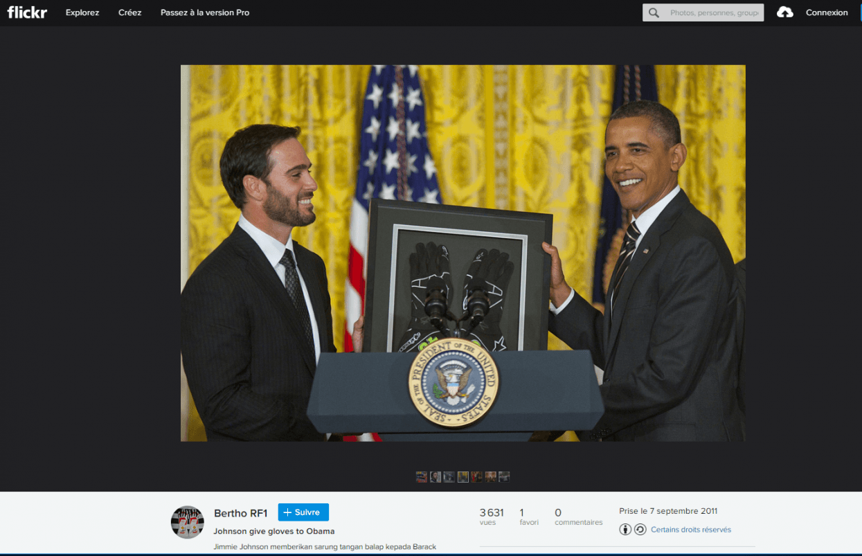L’agence AFP a prouvé qu’il s’agit d’un montage et présenté la photo originale qui montre en réalité le pilote automobile américain, Jimmie Kenneth Johnson, offrir des gants de conduite à Barack Obama. L’AFP explique en outre que la photo du président américain a été détournée à plusieurs reprises pour présenter Obama en train de tenir le portrait de différentes personnalités.